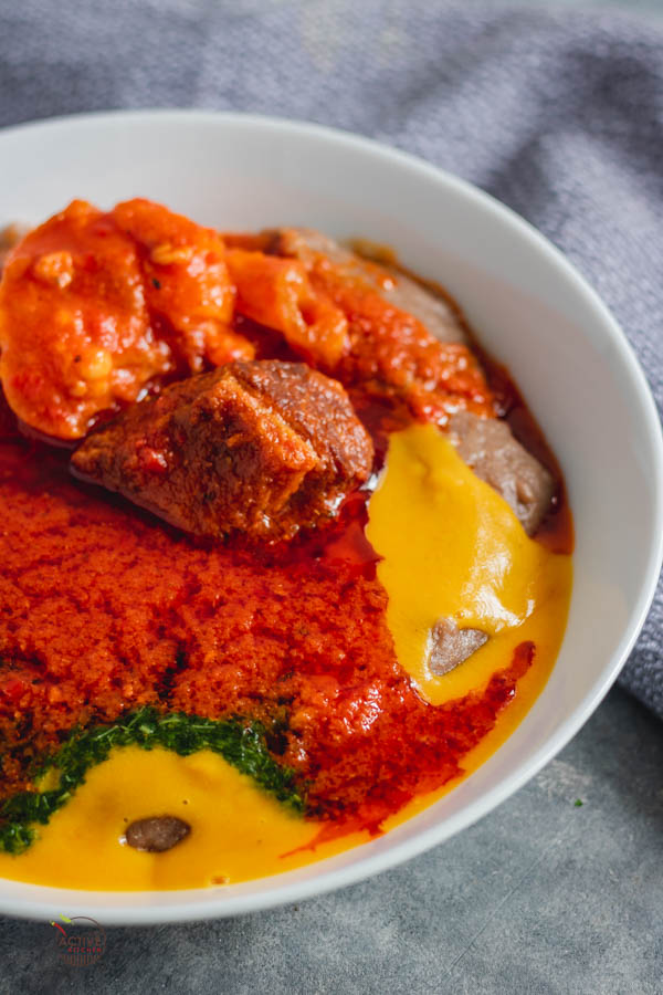 The stew, also called Ayamase, is extremely spicy and hot. It gets its bold flavor from bleached palm oil, fermented locust beans, and smoked dried shrimp.