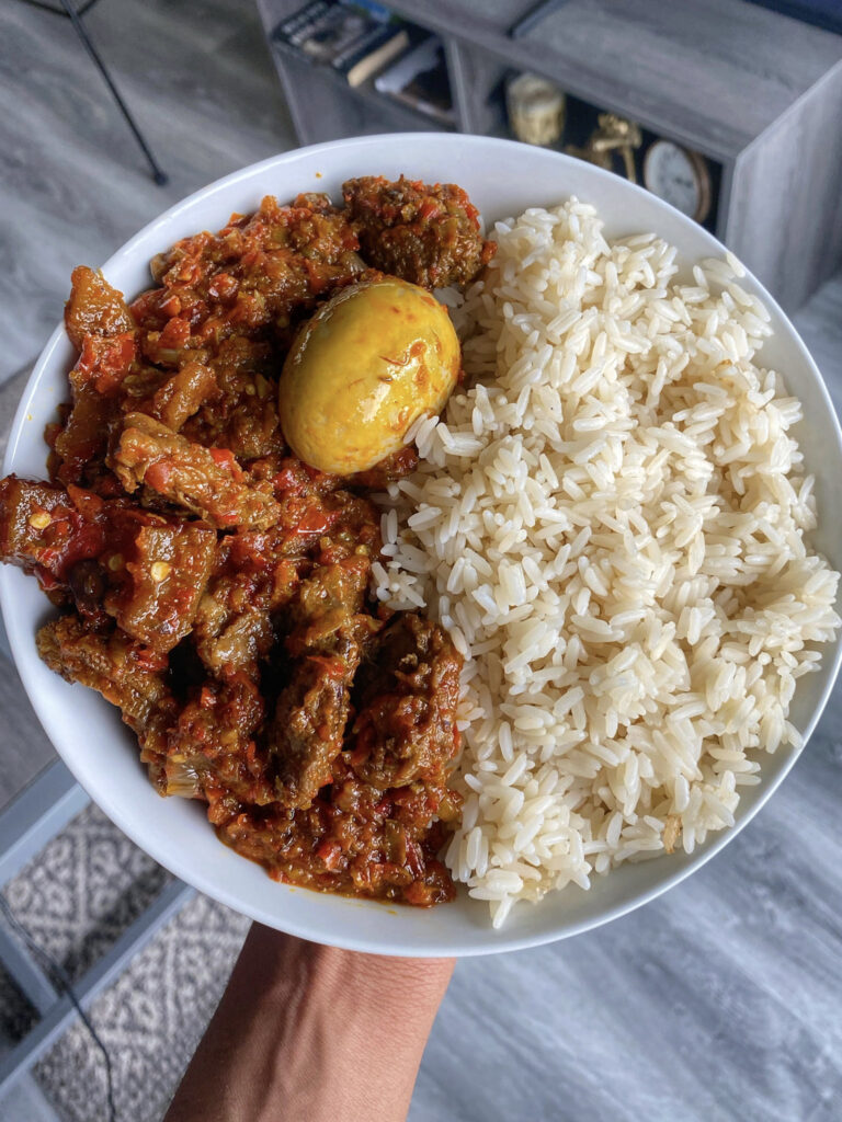 Ofada rice and stew is a traditional Nigerian dish from the Yoruba people in western Nigeria. You’ll find this meal popular throughout Lagos and surrounding areas.