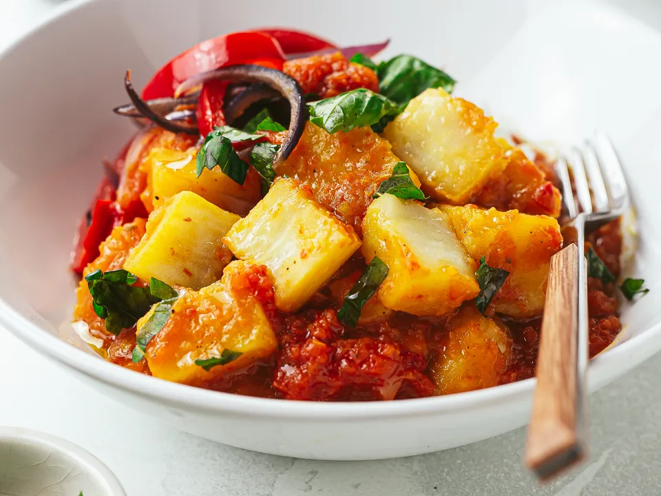The stew combines fresh tomatoes, peppers, and aromatic spices. You’ll love how the tender fish soaks up all the spicy red sauce.