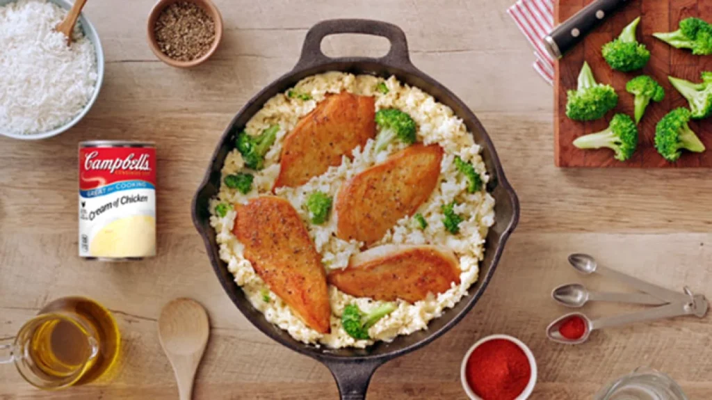 This classic comfort food combines tender chicken with fluffy rice in a rich, creamy sauce. You’ll use Campbell’s cream of chicken soup as the base.