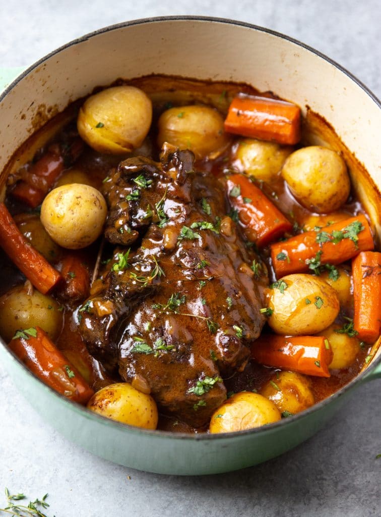 This classic dish pairs tender beef chuck roast with hearty red potatoes. Season the roast with salt, pepper, and herbs. Brown it in a Dutch oven, then add beef broth and quartered red potatoes.