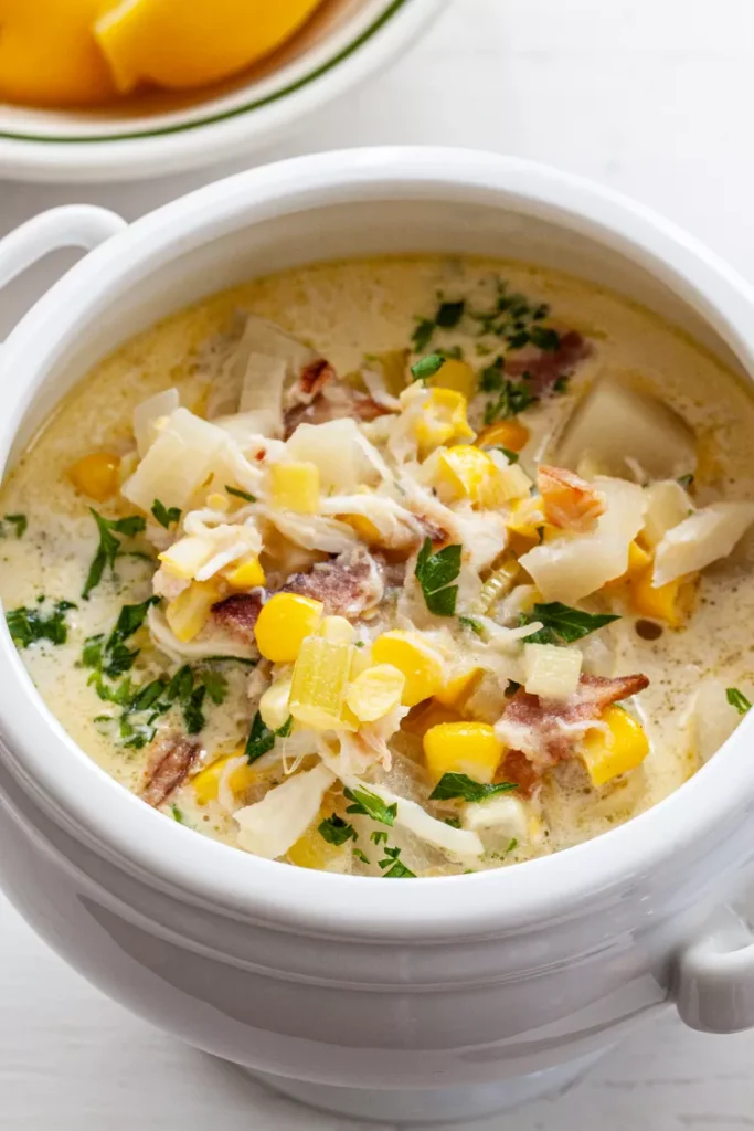 This creamy soup combines imitation crab with sweet corn kernels. You start by cooking onions in a pot until soft.