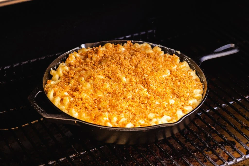 Smoked mac and cheese creates a creamy side dish with smoky flavor. Cook it in a cast iron pan for 45 minutes at 225°F.