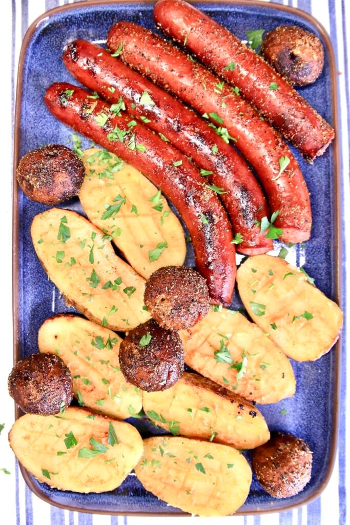 Baby back ribs need about 5 hours at 225°F using the 3-2-1 method. Smoked sausages take only 2 hours and don’t require much attention.