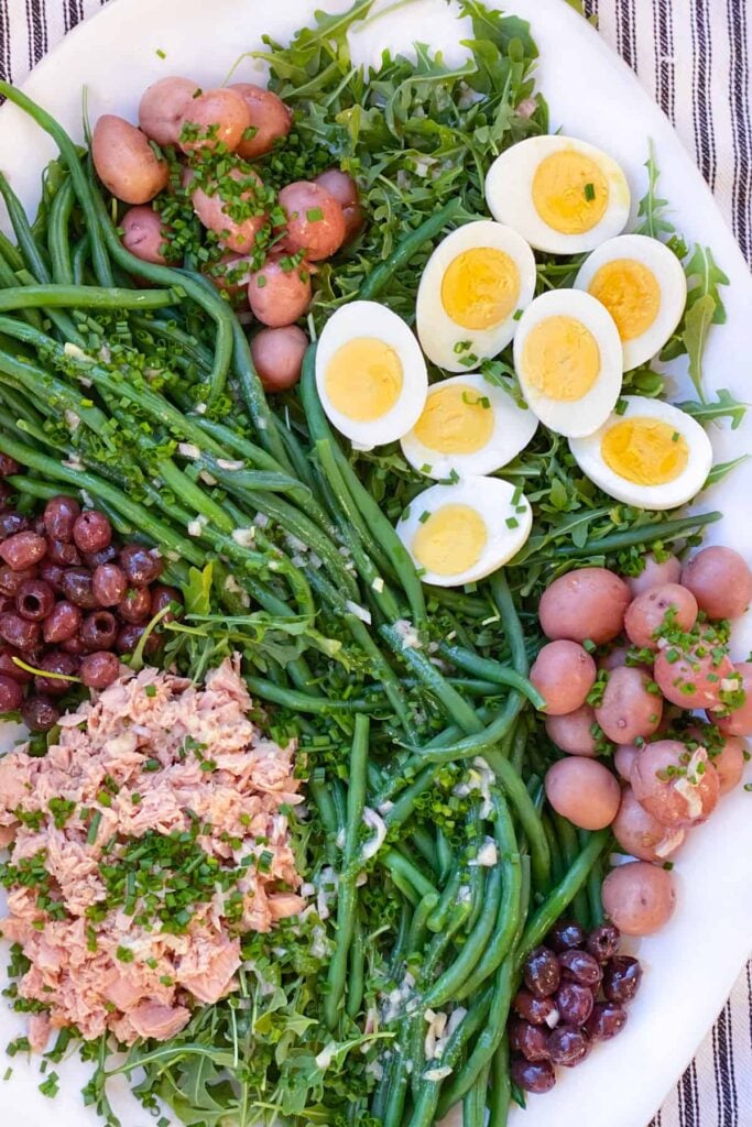 The traditional ingredients include crisp green beans, boiled potatoes, and hard-boiled eggs. Add black olives, cherry tomatoes, and fresh greens for color and texture.