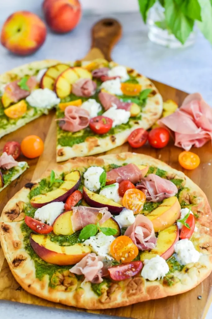 This Italian-inspired flatbread combines sweet grilled peaches with salty prosciutto. The mix creates a perfect balance of flavors.
