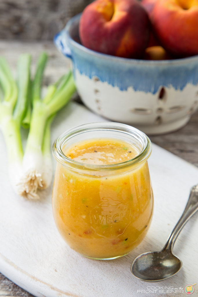 The peaches thicken the dressing naturally while adding fruity flavor.
