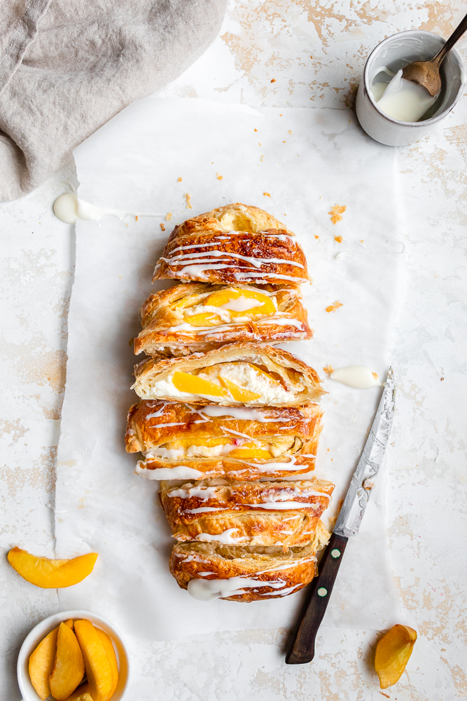 This pastry combines flaky puff pastry with sweet cream cheese filling and fresh peach slices. Make it easily for breakfast or brunch.
