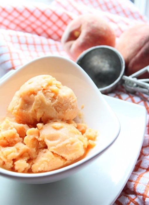 Peach sorbet makes a light summer dessert with just three simple ingredients: ripe peaches, sugar, and lemon juice.