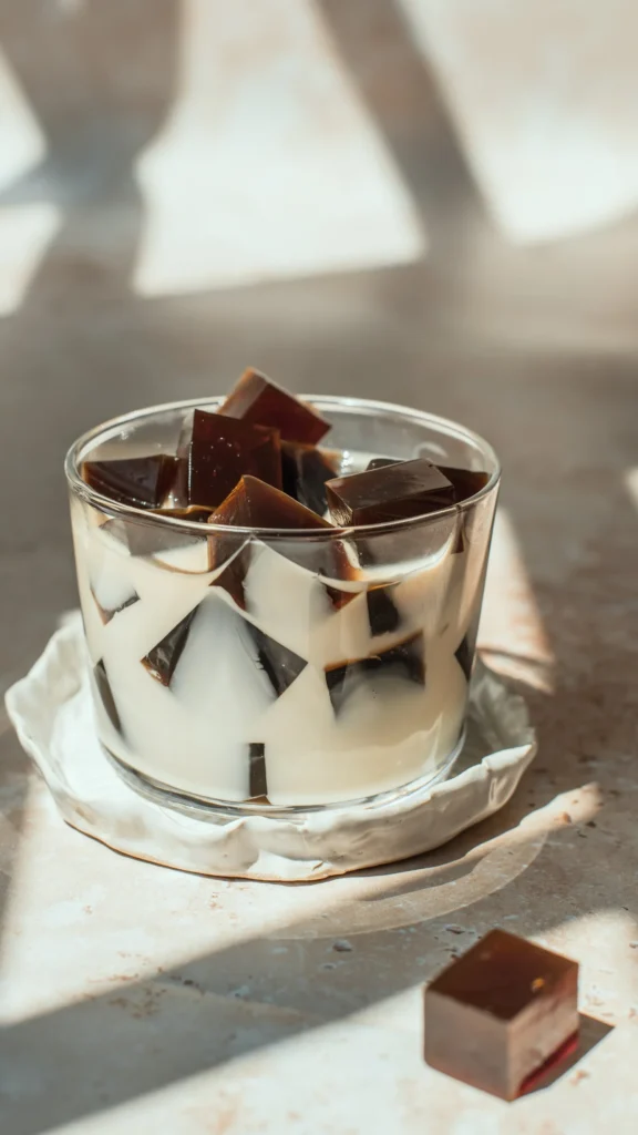 The dessert has a jelly-like texture that sits between gelatin and regular mochi. It’s smooth and refreshing with a mild sweet taste.