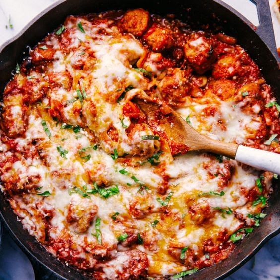 Instead of making huge meatballs, you’ll make little ones instead and cover the entire skillet with marinara sauce and cheese. Who can say no?