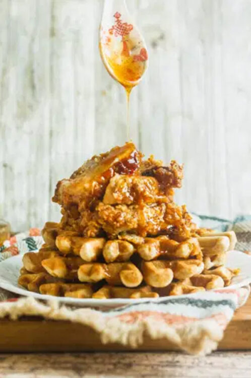 This chicken and waffles recipe is super unique because it includes a special spicy sauce that’s made with honey butter and chili powder. You can substitute maple syrup for the honey in the sauce.