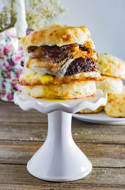 Spicy caramelized onions top this beautiful sandwich, and it’s served on a mouthwatering biscuit.