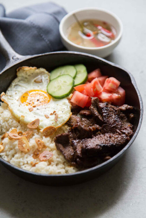 Tapsilog is a traditional meal from the Philippines that’s made with a fried egg, garlic rice, and a tapa.