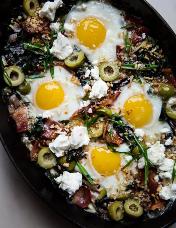 1. Baked Eggs with Green Olives and Swiss Chard
