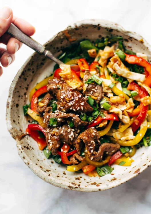 With a rainbow of colored bell peppers, greens, scallions, and Korean BBQ steak, this bowl is a meal fit for a king (or queen!).