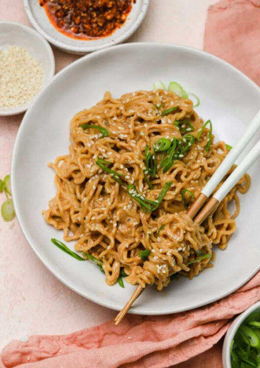 We love it when Asian dishes call for peanut butter. This recipe is full of dark brown sugar, toasted sesame seeds, ginger, garlic, and rice noodles.