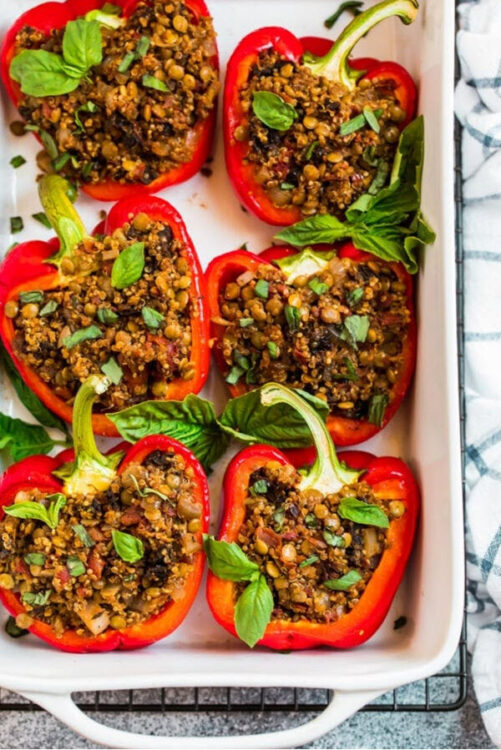 Anytime we can stuff red bell peppers, it’s a happy lunch. These peppers are full of robust Italian flavors and they’re a protein-rich meal thanks to the quinoa. Quinoa is famously rich in protein.