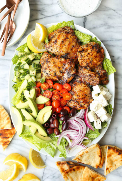 How does a Greek chicken salad sound? This one is made with juicy chicken thighs.
