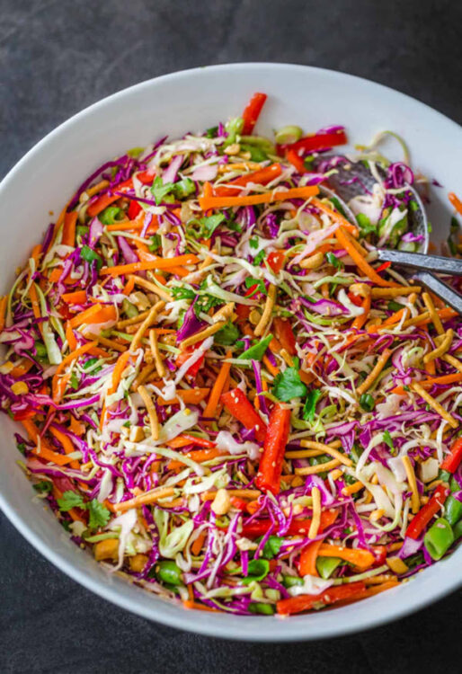 Veggies include red cabbage, green cabbage, red bell pepper, carrot, sugar snap peas, onion, and cilantro.