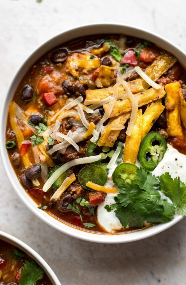 Serve this chili with sour cream, avocado, chopped green onions, and shredded cheddar cheese.