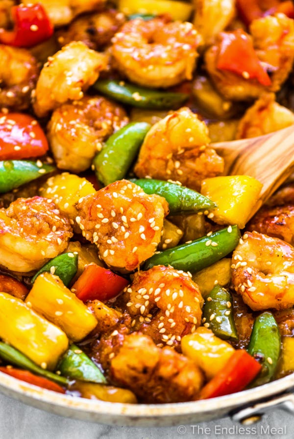 This shrimp stir fry dish is loaded with veggies such as sugar snap peas and red bell pepper, and the sesame seeds and chopped pineapple add interest, crunch, and flavor.