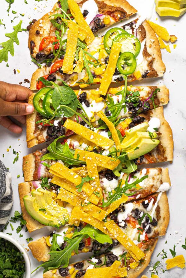 All you have to do is top this delicious Mexican flatbread pizza with tortilla strips and avocado, and you have a yummy vegetarian weeknight dinner.