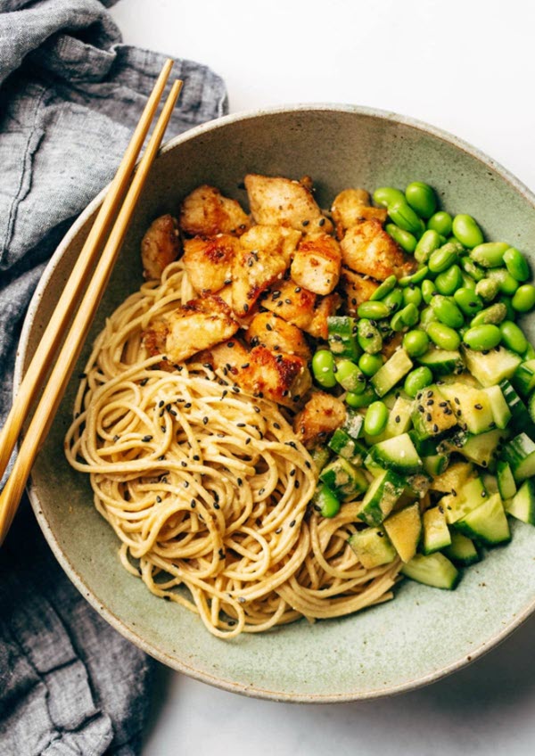 The chicken is perfectly browned, and these noodle bowls are loaded with nutritious veggies like salted edamame, cool and crispy cucumber bits, and garlic.