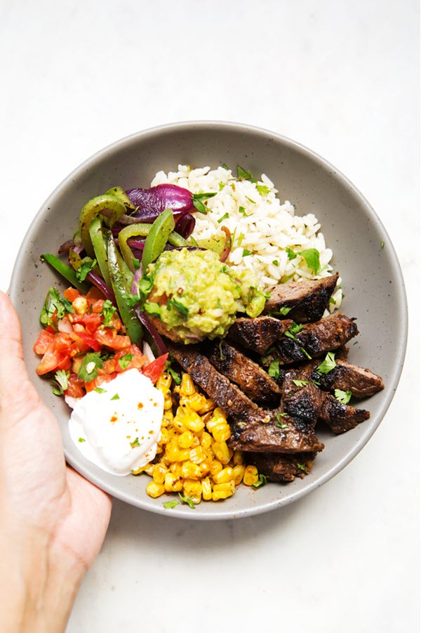 The day after you make chicken fajitas or steak fajitas, you can use the leftovers to make these delicious steak fajita bowls.