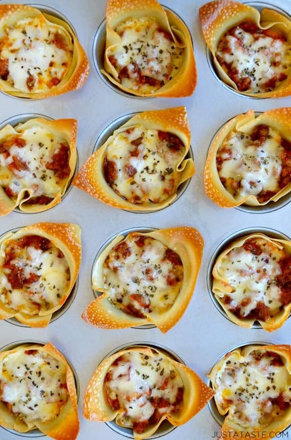 With parmesan cheese, ricotta cheese, and shredded mozzarella cheese, these lasagna bites will be gobbled up quickly.