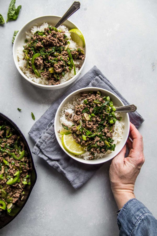 Serve your Thai beef over basmati rice, brown rice, or noodles. Garnish with a lime wedge so that you can squeeze fresh lime juice onto your finished dish.