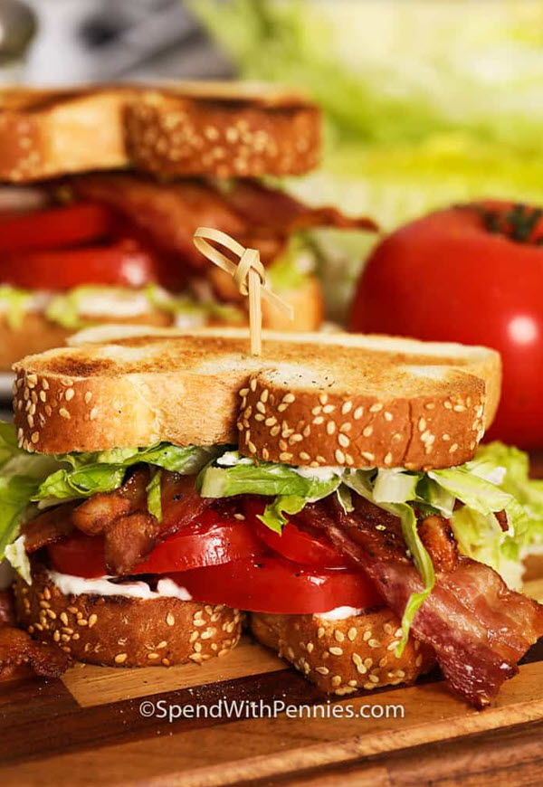 Naturally, we couldn’t make a list of dinner ideas with crisp bacon without including the classic homemade bacon, lettuce, tomato sandwich (BLT).