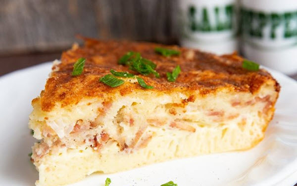 The dish has bacon, potatoes, and eggs. The flavor comes from green onions, garlic powder, and onion powder.