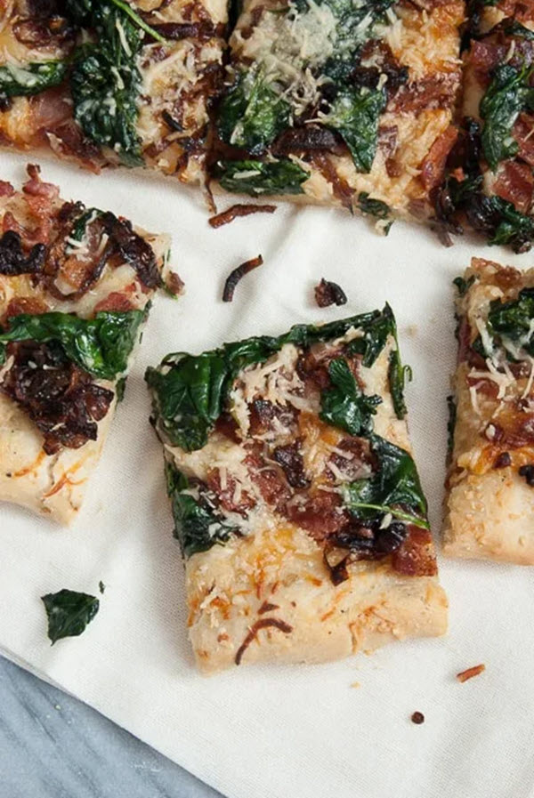 4. Caramelized Onion, Bacon, and Spinach Pizza