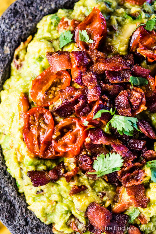 As if guacamole right by itself isn’t decadent enough, here we go adding in crispy bacon bits, five cloves of deliciously roasted garlic, and sweet roasted cherry tomatoes.