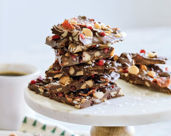 As it stands, the recipe calls for high-quality dark chocolate, chopped macadamia nuts, pomegranate seeds, and super crispy cooked bacon.