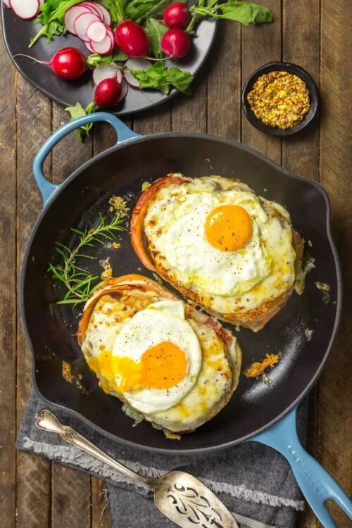 The Croque madame is typically offered open face so you’ll have two sides of this delicious recipe ready to eat for breakfast.