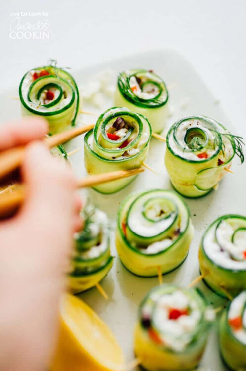 Cucumbers are sliced longwise and very thin to serve as the wrapping for your Greek salad.