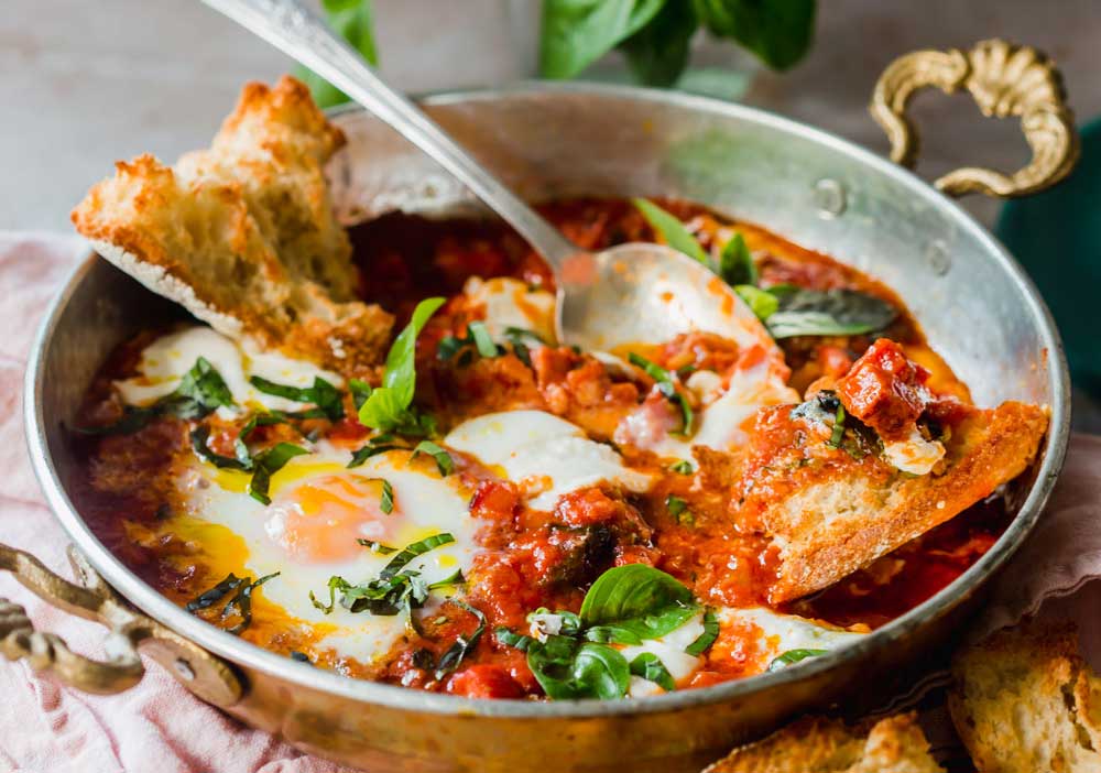 This recipe is incredibly versatile, so you can use make it with whatever you already have in the fridge! Featuring a rich tomato sauce, smokey sausage, and runny egg, this recipe is perfect for a quick breakfast or brunch and is low effort to make.