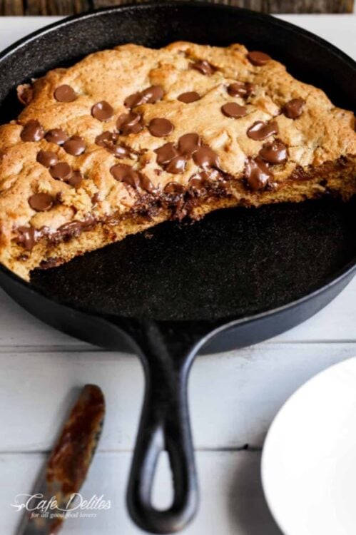 Few things are as comforting as a warm chocolate chip cookie, but this recipe for Nutella stuffed chocolate chip cookie baked in a skillet may just be the cure for all that ails you.