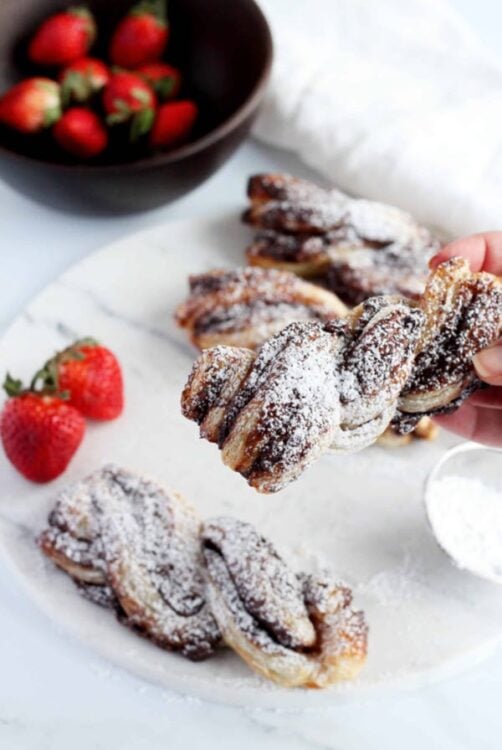 To make these chocolate pastries, you need store-bought puff pastry. Roll the puff pastry out and spread it with Nutella. The chocolate twists are then baked for about 25 minutes until they’re deliciously golden brown.