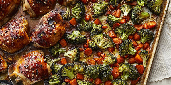 Sheet Pan Honey-Soy Glazed Chicken Thighs recipe features tender chicken in a savory-sweet honey garlic glaze with roasted carrots and broccoli.