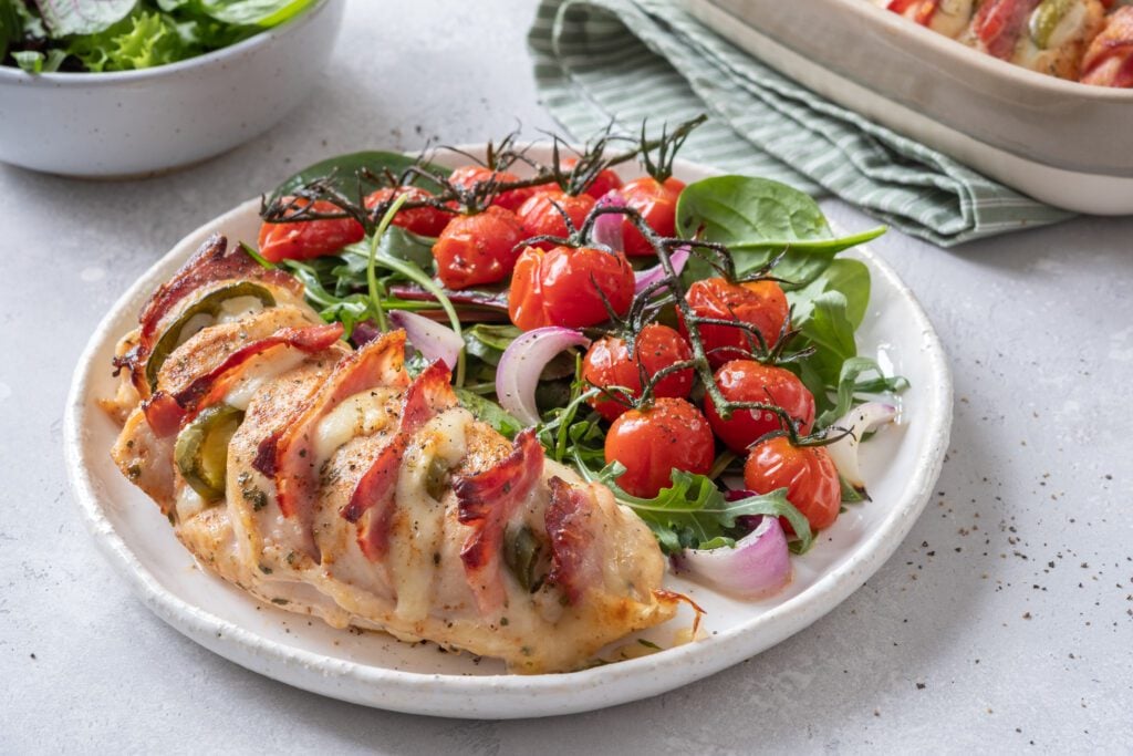 For a spicy, juicy, crispy, cheesy, and decadent chicken experience, you’ve not lived until you’ve tried Baked Hasselback Chicken Breast Stuffed with Bacon, Cheese, and Jalapenos!