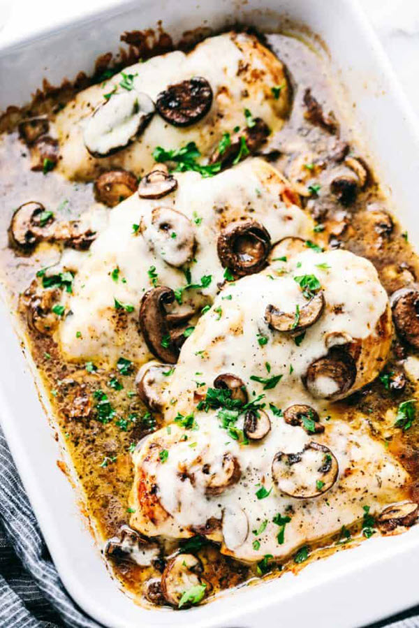 Craving mushrooms? This dish features juicy, seasoned backed chicken under mounds of melty cheese and covered in savory, flavorful mushrooms.