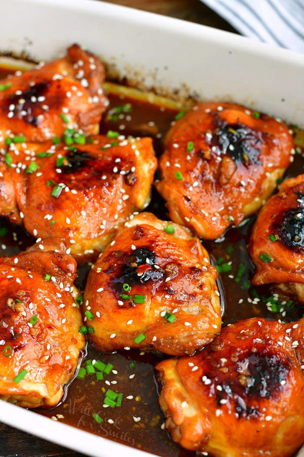 Another easy and flavorful dish you can make from scratch is this recipe for Asian baked chicken thighs. The main thing you have to do is mix your ingredients for the sauce, then pour it over your chicken, and bake!