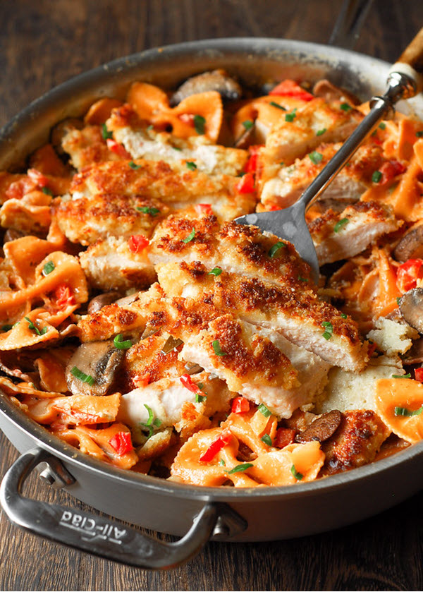 This recipe features savory parmesan-crusted chicken that sits on top of delicious bowtie pasta with green onions, mushrooms, and bell peppers swimming in a feisty New Orleans sauce.