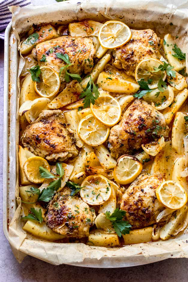 This simple but elegant meal combines juicy, tender chicken thighs with golden roasted potatoes baked in a deliciously zesty, seasoned lemon broth.