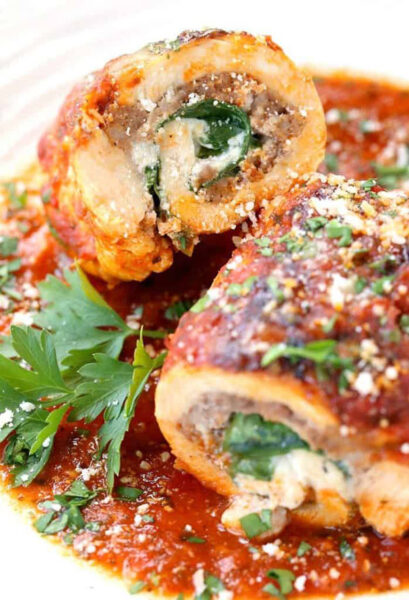 If you’re looking for a show stopping baked chicken dinner, then you’ll love this recipe for sausage stuffed chicken rollatini.