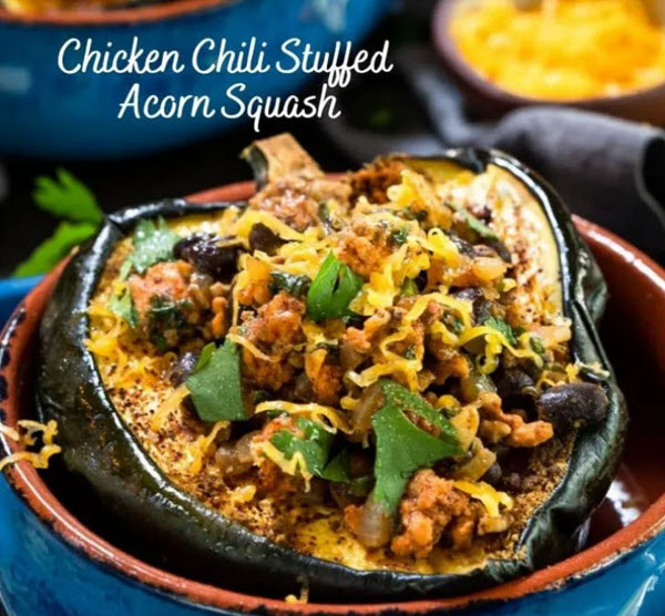 This savory, spicy dish is loaded with texture, color, and flavor. The acorn squash has a naturally sweet taste that contrasts beautifully with the spicy chicken chili.
