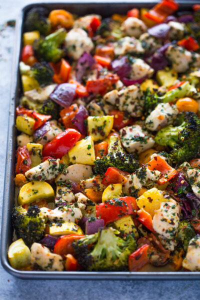 Another fantastic pan recipe is this garlic-roasted chicken and vegetable dish that’s loaded with delicious ingredients like red bell peppers, juicy chicken, broccoli, yellow squash, and more.